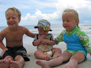 Landon is such a joy. I know I’ve said that a lot, but he really is. He has pretty much stolen my heart. He just smiles and giggles all the time. Sometimes you don’t even have to do anything – you just look at him and he’ll snort and laugh. It’s the sweetest sound on earth. He’s got the cutest head of hair right now. While Sloan sported a kickin’ mullet and Tia grew a mohawk, Landon is growing wispy blond hair all over his head, and no matter what I do, it always stands up straight. It’s so cute. I try to plaster it down but as soon as it dries, it bounces right back up. My baby wants to crawl right now, something I’m not to crazy about but I know it’s inevitable. He gets frustrated with being immobile and will eventually just start making noise until someone picks him up. He loves his voice and squeals and talks just to hear himself. All around, he’s just a great kid and I can’t wait to see what he’s going to be like as he gets older. I get the impression that he’s going to be the family clown. He’s gonna be the one always looking for a laugh. He definately brings a unique joy to our family unit.